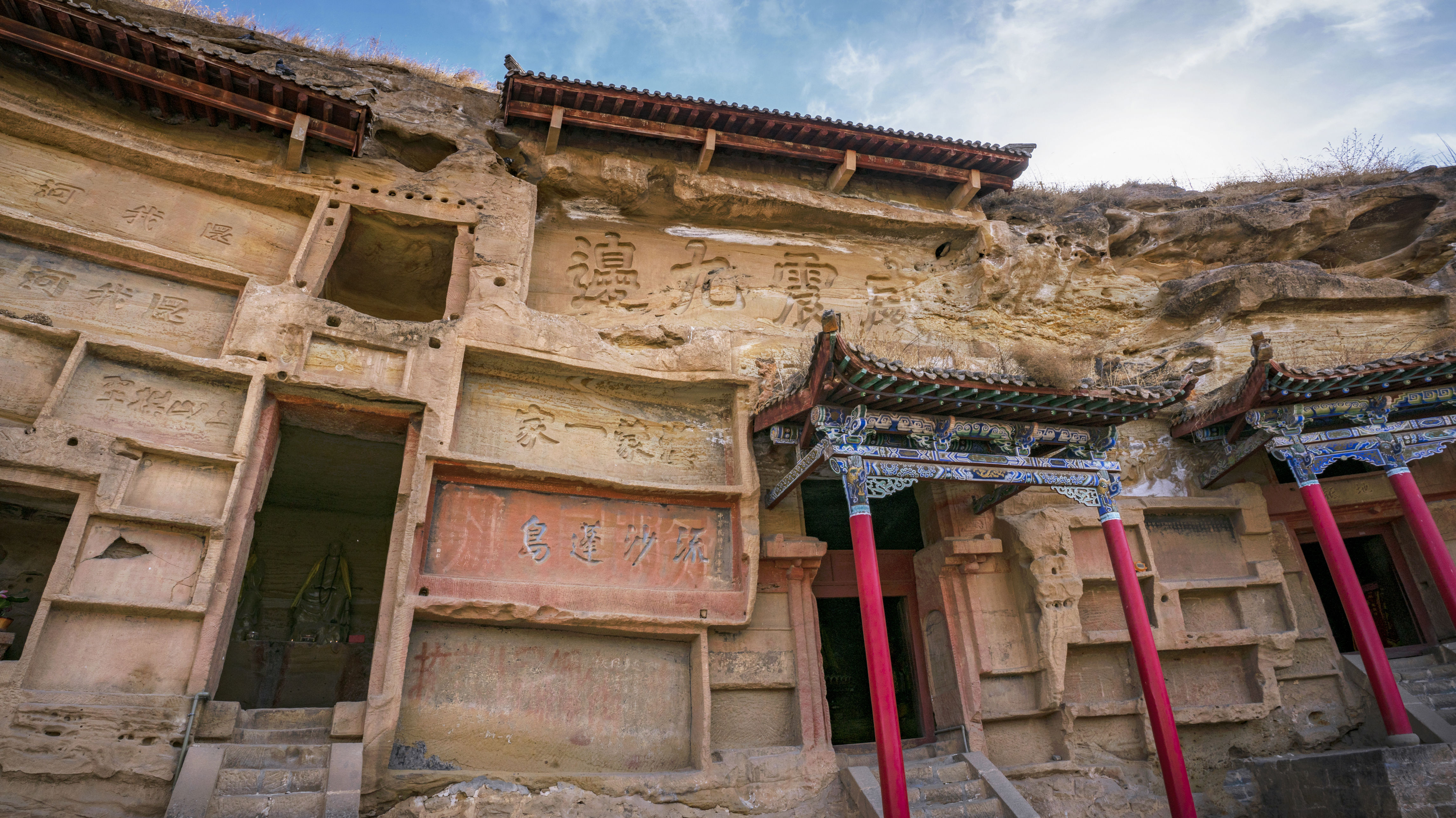 榆溪河东侧还保留着30余处石窟龛洞,但缺憾的是,石窟内部的佛像都是新的造像,之前的佛像的遗迹都被毁了,果真很纳闷,因此拍拍佛龛古刹的外景就行了,摩崖石刻是这里最大的看点。