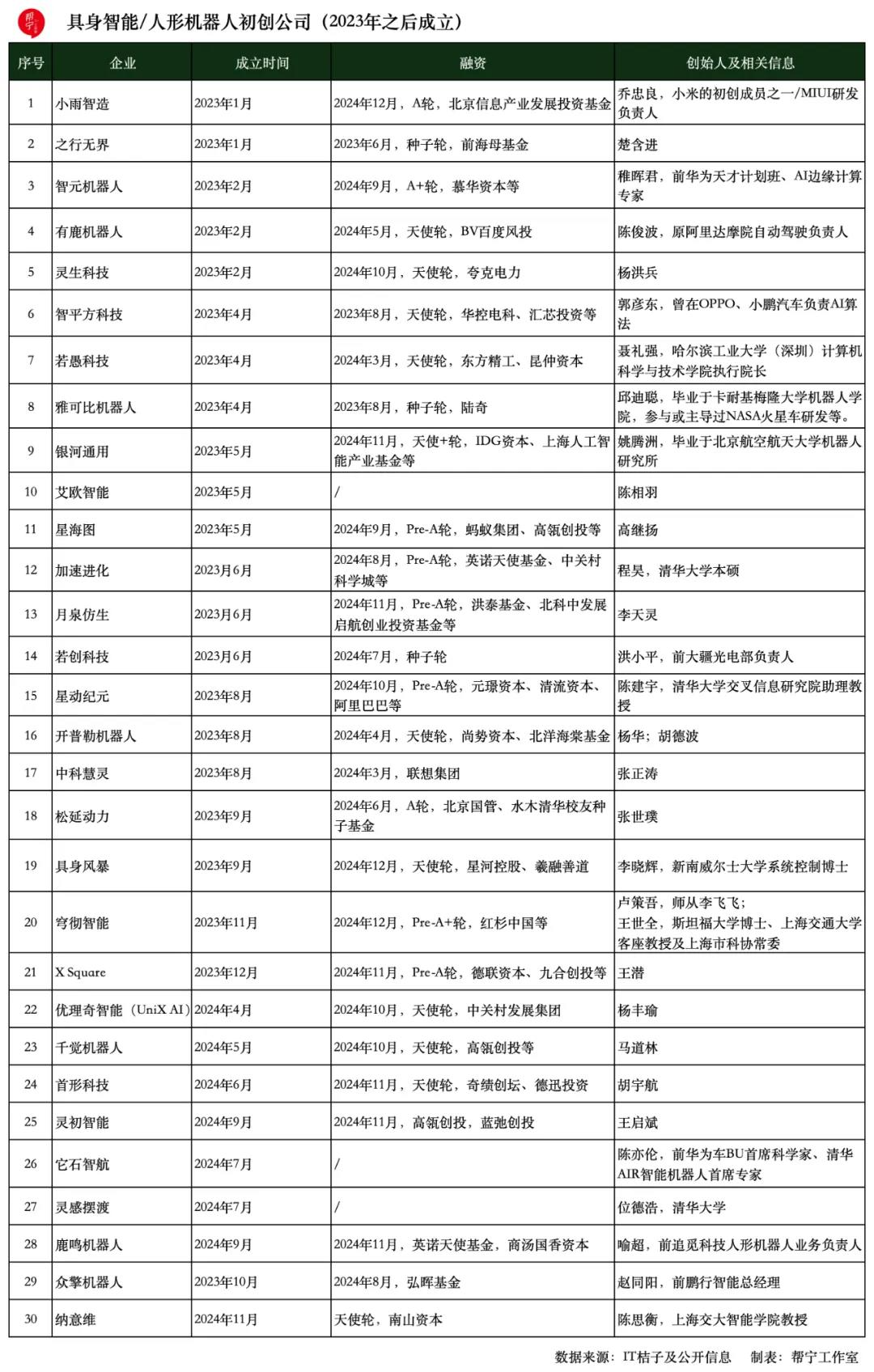 据伪善足统计,自2023年以来,新成立的具身智能机器东谈主公司有30家,首创东谈主及团队大多来自汽车、自动驾驶等规模,且此类公司多以软件算法为根底,是产物征战中的“大脑”。