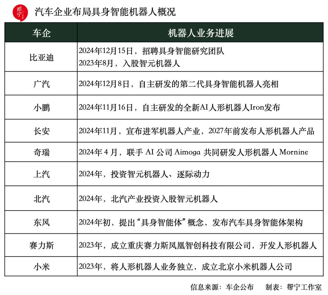 12月15日,比亚迪招聘平台自满,拟面向2025届全球高校硕士、博士毕业生,招聘具身智能策动团队。早在2022年,比亚迪就成立具身智能策动团队,2023年出资191万元入股智元机器东谈主,本年又稽查北京具身智能机器东谈主创新中心、星动纪元、加快进化公司,可见其对该行业的关注。