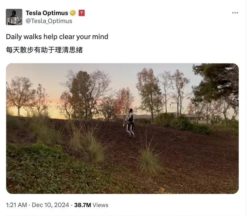 2022年10月,特斯拉东谈主形机器东谈主第一次亮相,再次佐证马斯克要把特斯拉打形成科技公司的愿景。适度咫尺,特斯拉机器东谈主依然进化至第三代。本年12月10日,特斯拉在酬酢平台X上发布Optimus机器东谈主在陡坡上散播的视频。