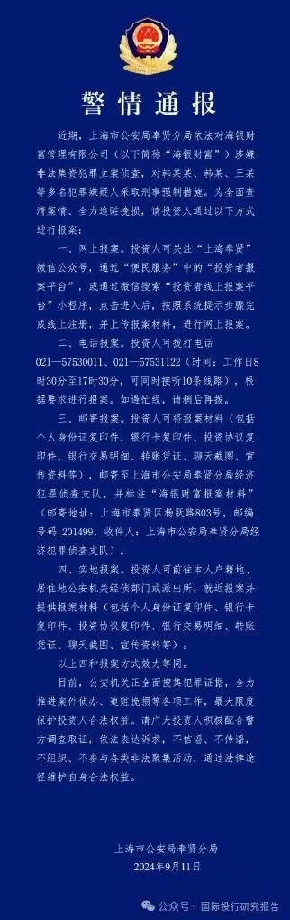 近期,上海市公安局奉贤分局照章对海银钞票处置有限公司(以下简称“海银对富”)涉嫌违警集资违警立案窥探,对韩某某、韩某、王某等多名违警嫌疑东说念主采纳刑事强制治安。为全面查清案情、全力造赃挽损,请投资东说念主通过以下形态进行报案: