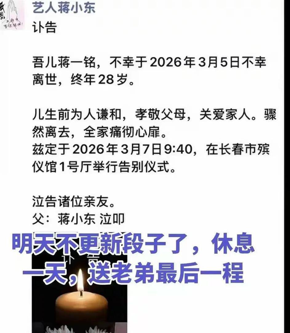弃世的是蒋小东的独子——蒋一铭。 才28岁,长得跟父亲像一个模型刻出来的。 正月十五那天,他还陪着亲妈杨洋回旧地给姥姥姥爷送灯,视频里的小伙子壮壮的,跟长者说谈笑笑。