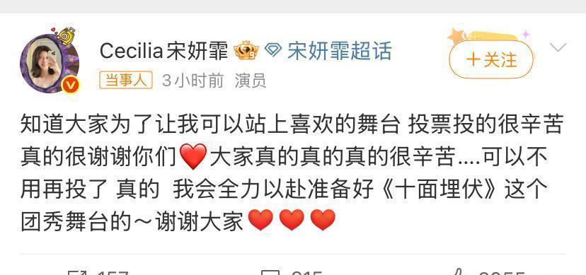 2025年5月14日,《乘风2025》总决赛前夜,宋妍霏遽然在微博发文号令粉丝住手为其1V1舞台投票,直言“遵守已定,把契机留给更需要的东说念主”。这番操作遽然引爆热搜,毕竟在选秀节目里让粉丝停投,几乎比让叶童烧毁rap还不能念念议。要知说念宋妍霏但是从一公到三公说合夺冠的“不败女王”,遽然在决赛前摇旗呼吁,到底是真·东说念主间贯通依然节目组安排好的虐粉脚本?