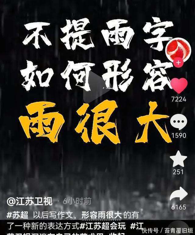 更绝的是,在苏超第五轮常州对阵南京的比赛本日,天公还不作好意思,下起了瓢泼大雨,把通顺员们浇了个透心凉。于是,江苏卫视又搞了个新的轮廓视频,主题是“不提雨字,怎样描摹雨很大?”