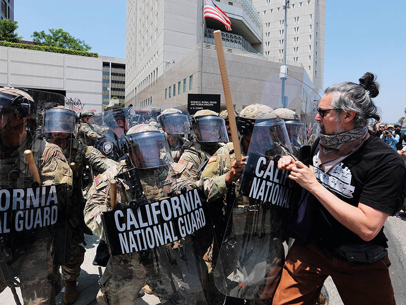 在好意思国加利福尼亚州洛杉矶市中心的联邦法则机构门前,抗议者与国民警卫队东谈主员发生冲突(2025 年 6 月 8 日摄) 新华社发(邱晨摄)国内“维稳”:以集权推动保守议程