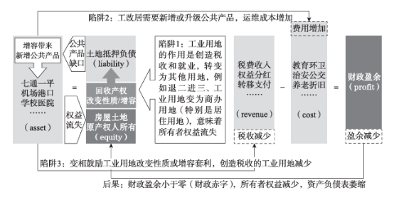 深广的工业用地转变性质成为商办用地(以致居住用地),都意味着通盘者权柄的流失。如果还要进一步增容a,流失得就更多,这些都是城市转型必需的“终末一桶金”。工业用地改变性质和增容,也会带来人人家具运维成本( 也便是一般财政支拨)的增多。产业迁徙税收减少,运维成本上升,“一降一升”,更新非但莫得带来财政盈余,反而导致财政赤字,使本来就过剩的商办用地雪上加霜,浪费了城市服务升级以及产业迁徙的肃肃契机。这么的工业用地更新模式,背后其实是巨大的财务罗网(见下图)。