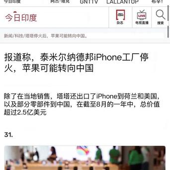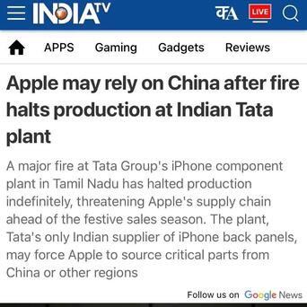 印度媒体10月1日报说念:“印度塔塔工场生气停产后,苹果可能依赖中国。”9月28日,塔塔电子位于泰米尔纳德邦的苹果iPhone零部件工场发生大火,该事件对苹果在印度地区的iPhone供应链形成了严重影响。