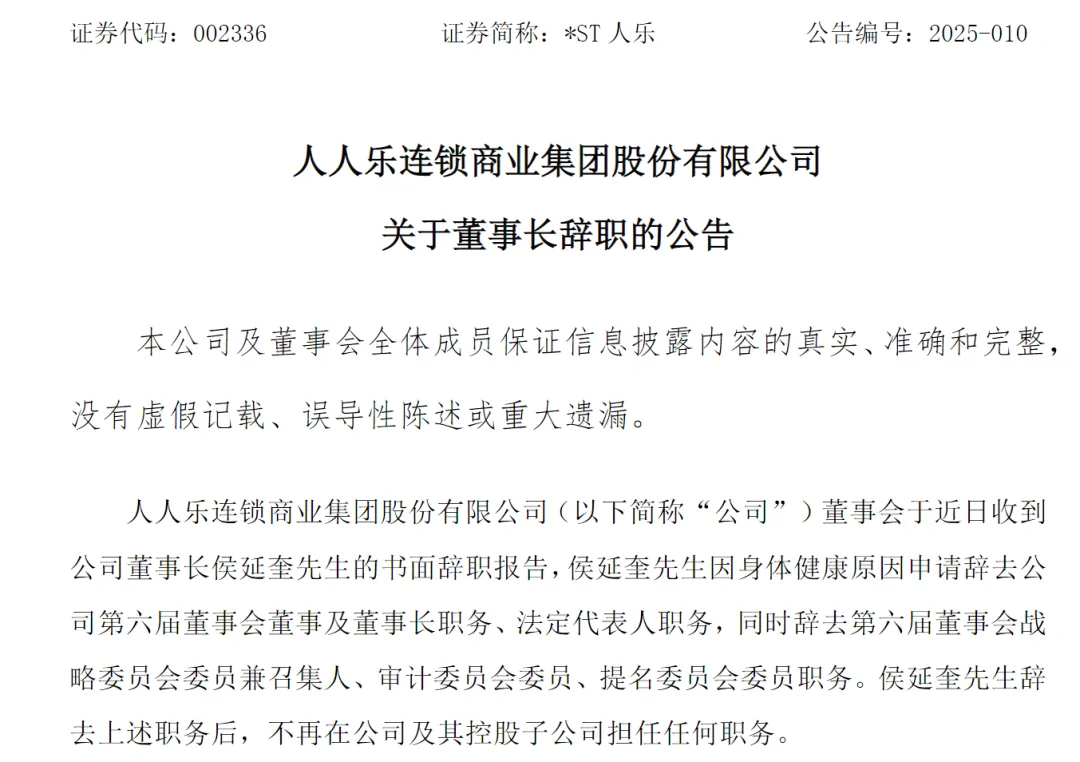 此外,在风雨飘飖之际,东谈主东谈主乐董事长侯延奎却霎时“火线”辞职。2025年3月19日晚,东谈主东谈主乐霎时公告称,上任仅一年半的董事长侯延奎因躯壳健康原因央求辞职,卸去包括董事、董事长及法定代表东谈主在内的统统职务。
