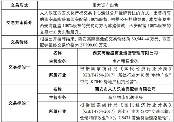 12月13日,*ST东谈主乐发布公告称,西安高茂盛、西安配销100%股权在西安文化产权往复中心的挂牌转让期限已满,往复对方分手为陕西韩建信诚投资结伙企业(有限结伙)(简称:韩建信诚)和西安东和晨升买卖运营惩办结伙企业(有限结伙)(简称:东和晨升),往复价钱分手确定为6.05亿元和2.79亿元。