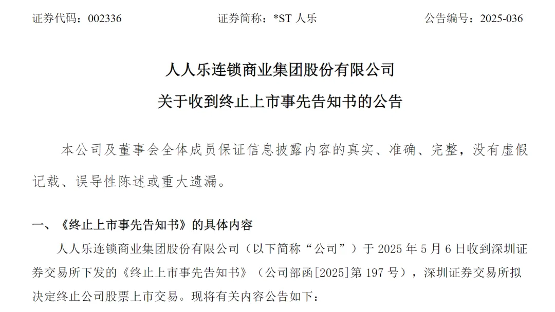 5月7日晚,*ST东谈主乐(即东谈主东谈主乐,002336.SZ)发布公告称,公司于2025年5月6日收到深圳证券往复所下发的《斥逐上市事前见知书》,深圳证券往复所拟决定斥逐公司股票上市往复。