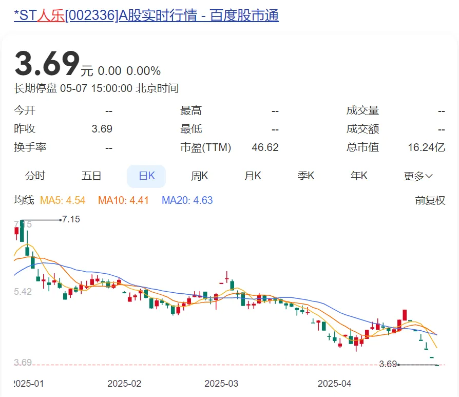当今,东谈主东谈主乐股票已停牌,停牌前股价相连多日跌停,年内已跌超40%,总市值还剩16.24亿元。