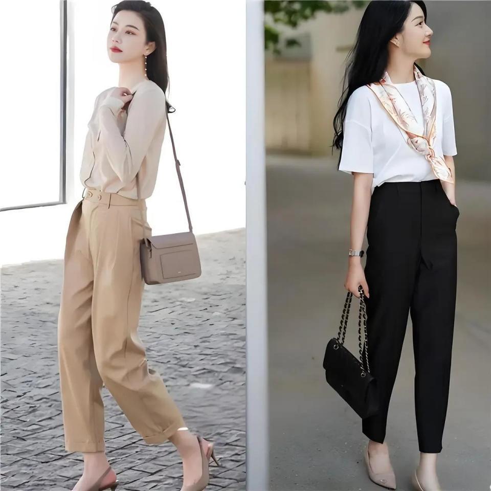 闲居情况下来说其实不太保举大家遴荐玄色的西装裤,举例底下这种玄色的西装裤,搭配白色的短袖T恤,看起来就会有点精采,还不如换成左边的这一条卡其色的西装裤搭配上杏色的上衣,这么的穿衣配色更经典,并且不会显得过于千里闷。