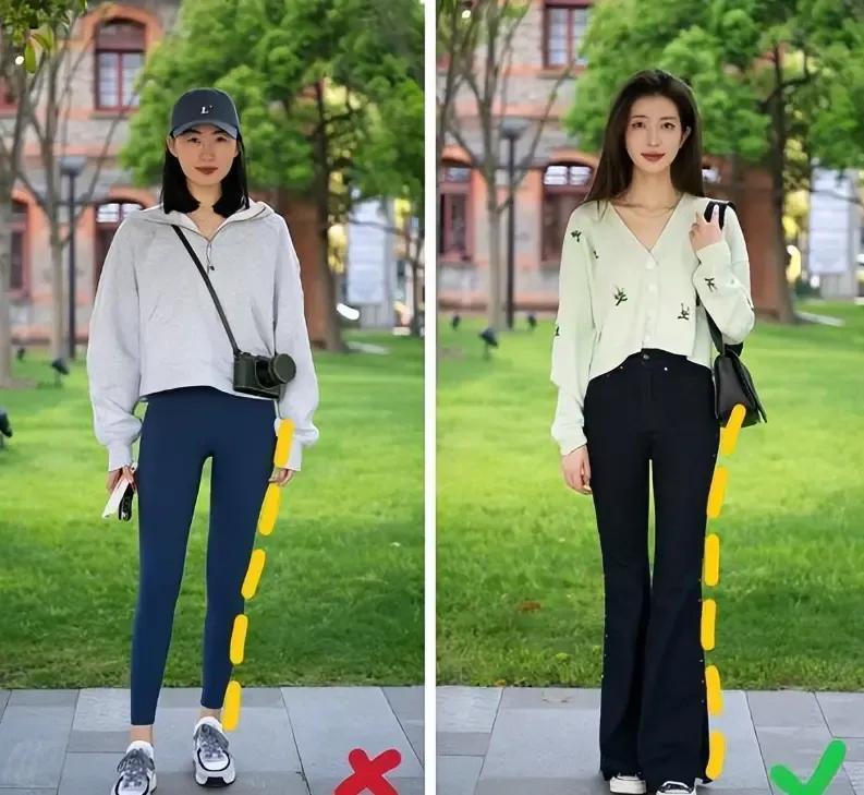 就算你的体魄比例还可以的情况下,外出也尽量少穿像鲨鱼裤、健身裤,穿错门可能莫得像右边的这一条玄色微喇叭裤多礼。