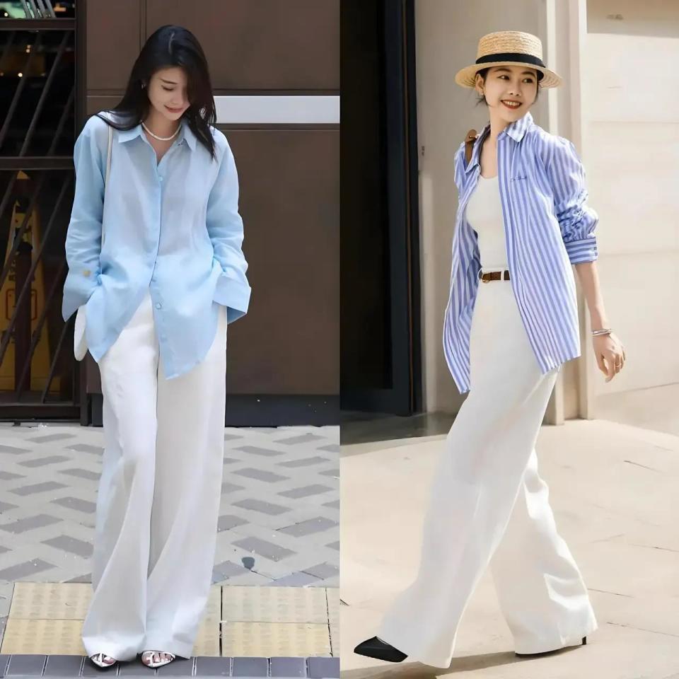 有的时辰要造成一个撞色的配色会更好意思瞻念,举例底下用浅蓝色衬衫搭配白色阔腿裤,大概是蓝白条纹衬衫搭配上白色的阔腿裤,扫数造型的配色是不是更有档次感,显得就不会那么的单调。