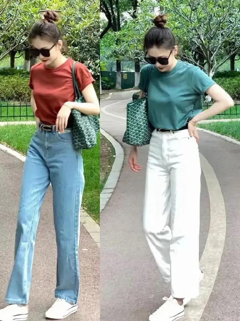 也可以遴荐短袖T恤上衣来搭配上牛仔裤,可以像底下这位博主用微喇叭裤,阔腿裤大概是直筒裤来搭配都完全莫得任何问题,从简又大气,相比日常的穿搭作风。